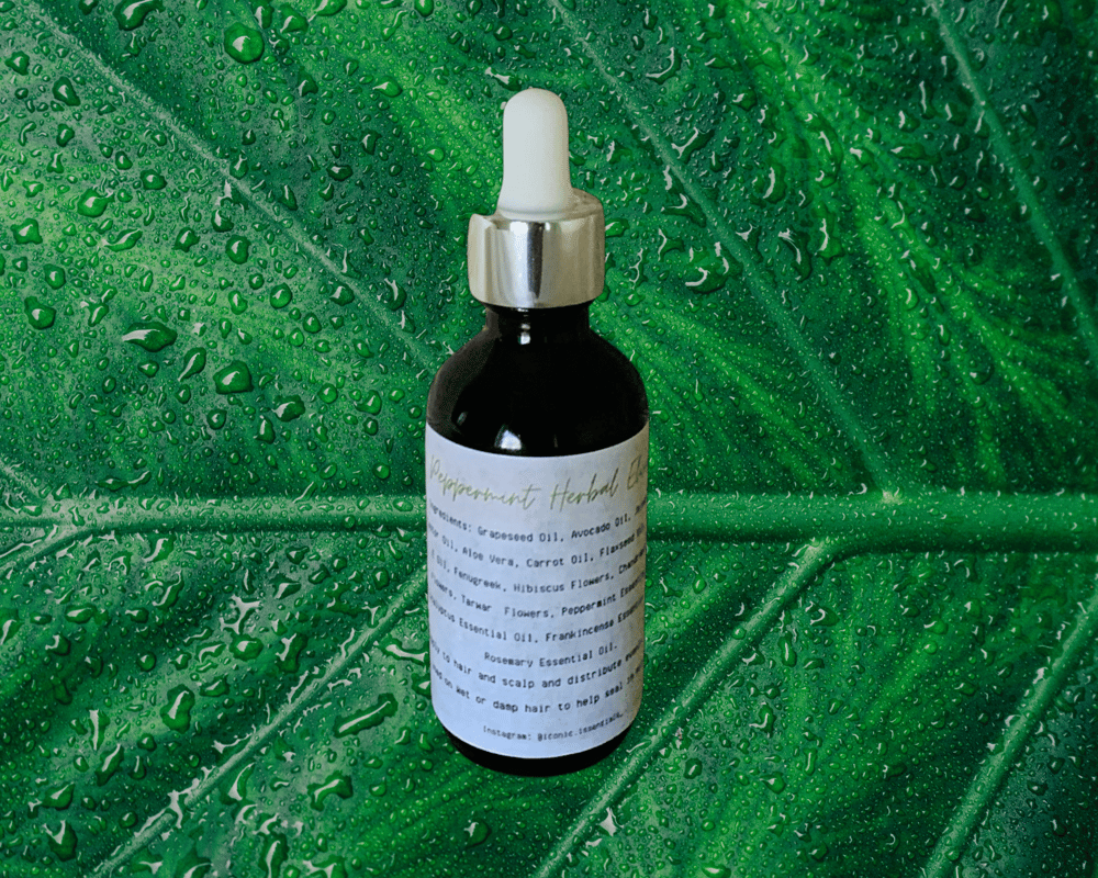 Meet our Peppermint Herbal Elixir, made with Grapeseed Oil, Avocado Oil, Jojoba Oil, Castor Oil, Aloe Vera, Carrot Oil, Flaxseed Oil, Vitamin E Oil, Peppermint, Eucalyptus, Frankincense, and Rosemary Essential Oils. These oils have been infused with Peppermint, Fenugreek, Hibiscus, Chandramoolika, and Tarwar Flowers. This elixir can be applied to the scalp when wearing protective styles and added to your ends and scalp while deep conditioning. This elixir does contain all organic ingredients.